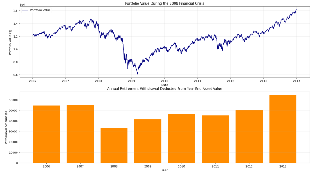 Even though the portfolio eventually recovers and surpasses its original value by 2013, that recovery isn’t smooth. For several years after the crash, both the portfolio value and withdrawal amounts remain lower than they would have been otherwise, because everything is compounding from a reduced base.
