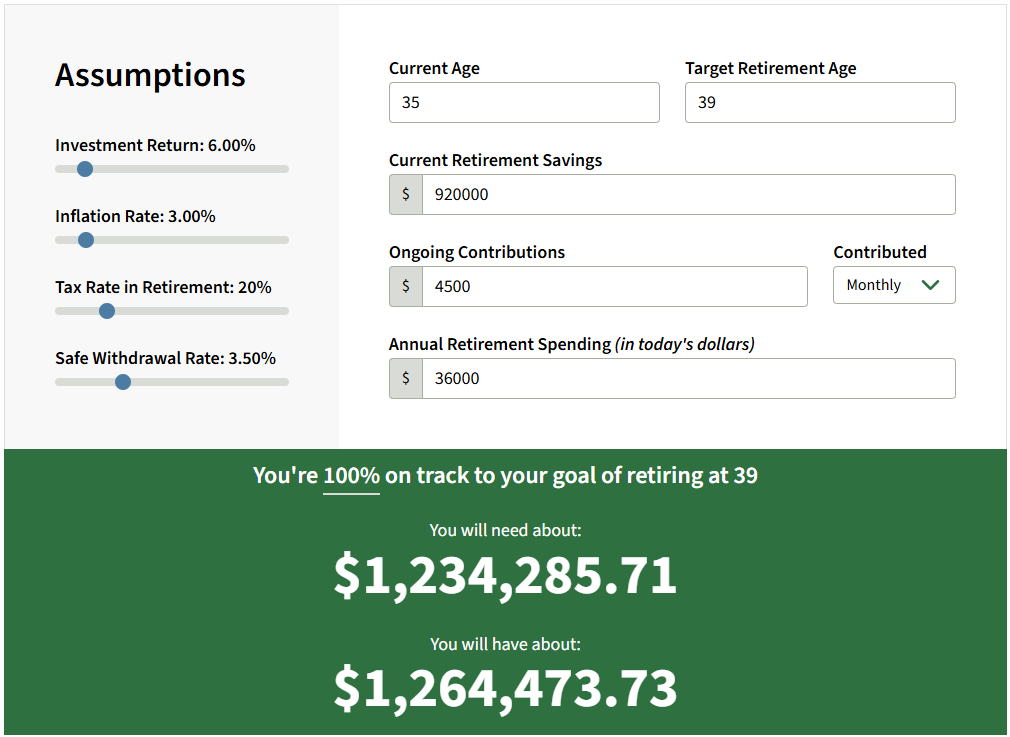 If you’re reading this post, you’ve probably tried punching in your numbers into an early retirement calculator to see how close you are to FIRE. I did the same thing, and the result showed that I’m 100% on track to retire by age 39.